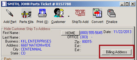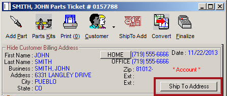 Parts only tickets allow you to have different Bill To and Ship To addresses. If you have the Ship To Address box checked in Repair Order Options in Configuration, you are prompted for a Ship To address.