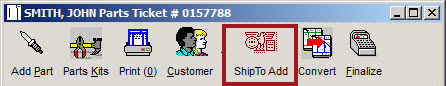 The Ship To Add button appears in the ticket toolbar only if you check Ship To Address in Repair Order Options in Configuration. When this option is checked, you will also be prompted for a Ship To address when you first create a parts only ticket.