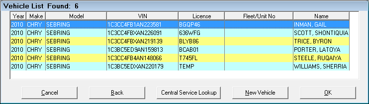 Search for a vehicle directly, the Vehicle List open displaying all the matching vehicle records and the customer associated with each.