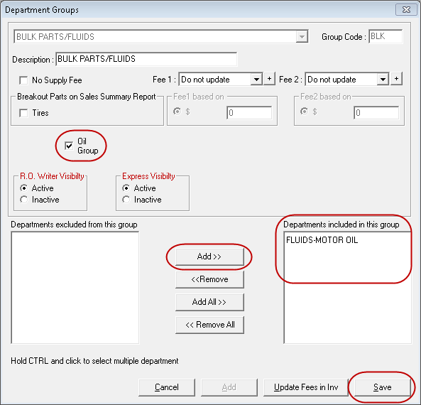 One of the advantages of putting oil parts in an oil group is that you can change the fees and click Update Fees in Inv to update all the parts in Inventory at one time. This is the best way to manage fees for oil parts globally.