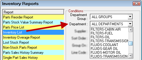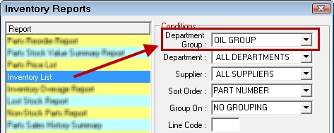 Before creating the oil group, we recommend that you review which parts are in the parts departments you want to include in the oil parts department group. The fastest way to do this is to run an Inventory List report by parts department.