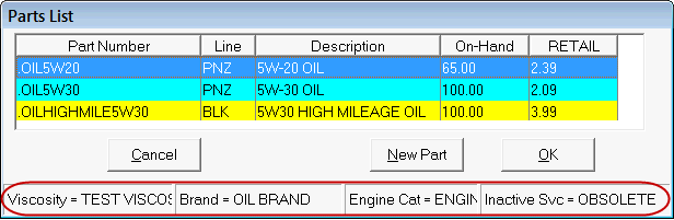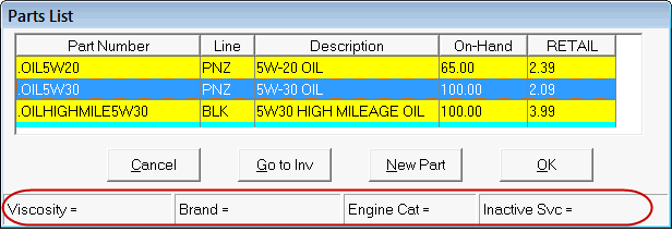 - At the bottom of the Parts List window that comes up during part searches throughout the system. If an oil part is part of an oil group, the oil information fields display.