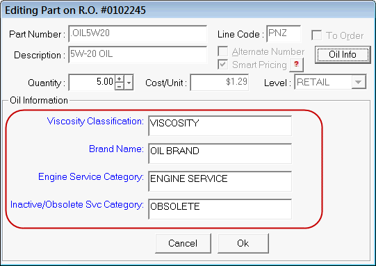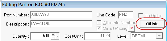 If you want oil information you add or edit via the Oil Info button to appear on other estimates and repair orders, you should update the master part record in Inventory.