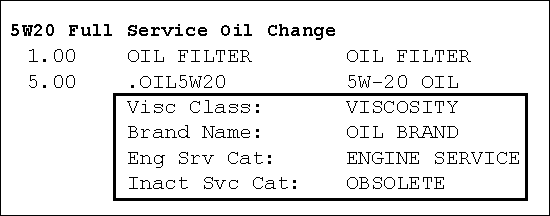 If the oil information fields contains data at the time the document is printed, that oil information prints with the part on estimates, work orders, and repair orders.