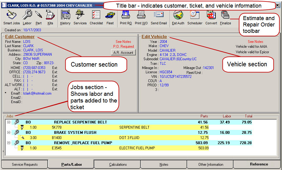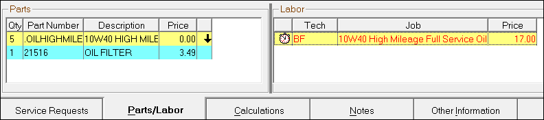 When you create a new estimate or repair order, the ticket opens to the Parts/Labor tab.
