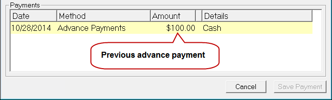 - Click the Advanced Payment button. On the Advance Payment window, the previous advanced payment appears in the Payments section.