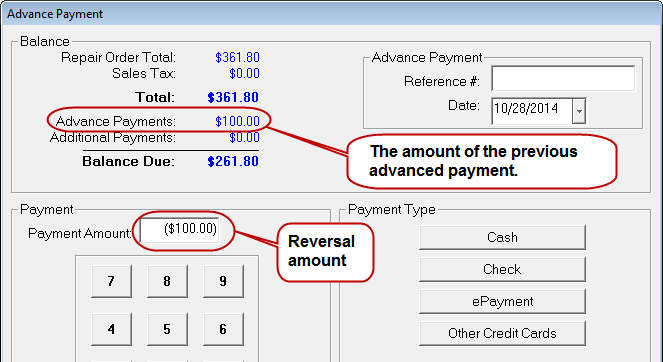 Before the repair order is finalized, you can enter another advanced payment in a negative amount, which effectively reverses the original advanced payment amount in the repair order.