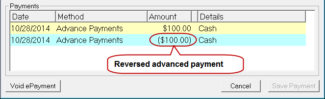 - Click the Save Payment button. The previous advanced payment amount is reversed.