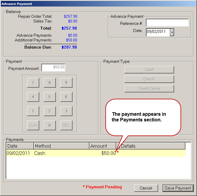 You may want to give your customers more flexibility by allowing them to make advanced payments. An advanced payment is one made on a repair order before the repair order is finalized. Often, these payments occur before work begins on a vehicle.