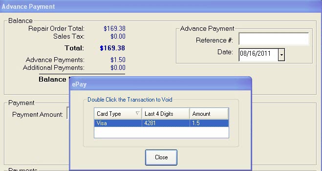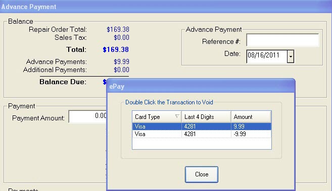 - Select another transaction to void or click the “Close” button to return to the repair order advance payment window.