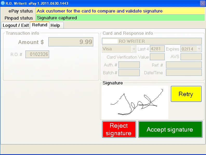 - If the option “Require Electronic Signature Validation” was selected in ePayment Configuration, you will be required to press the green Accept Signature button to continue or the red Reject signature button to exit. If that option was not selected, the process will be continued automatically once the signature is captured.