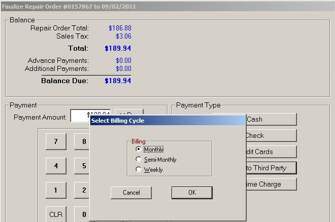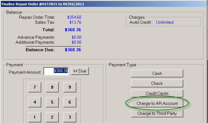 To charge the repairs to another customer's account, click the Charge to Third Party button on the finalize payment window. You need to search for the customer.