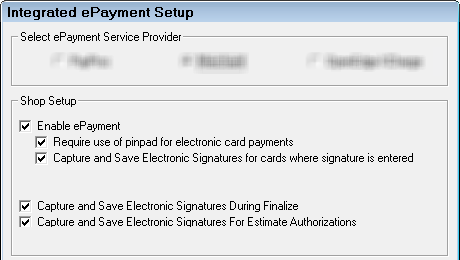 The Electronic Payment Setup window contains specific options for each type of electronic payment system available in R.O. Writer: