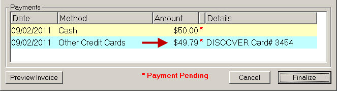 - Click OK and the payment appears in the Payments section at the bottom of the window. (No electronic transaction processes when you click OK.)