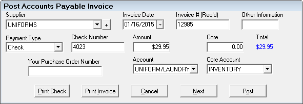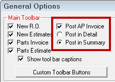 The Post AP button appears in the main toolbar only if the Post AP Invoice option is enabled in Configuration > File > General Options. When you select Post AP Invoice, you must select either Post in Detail or Post in Summary.