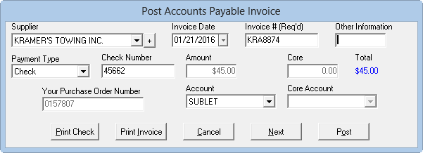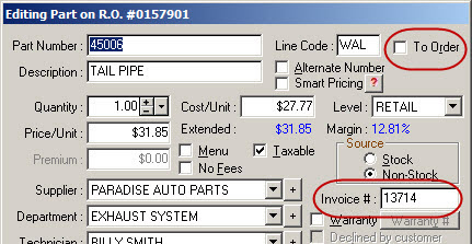 Select the appropriate supplier and complete the rest of the information about the part. When the part has been posted the invoice number is added to the part and the To Order box is unchecked.
