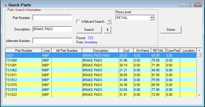 This button appears only if the Central Office module is active in your installation of R.O. Writer, you can review inventory from other stores by clicking the Stores button. |