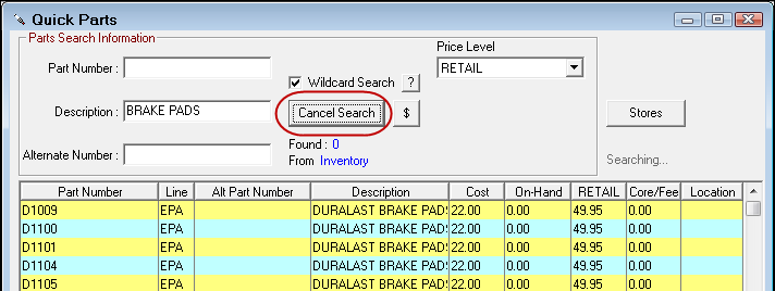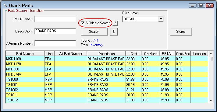 When the Wildcard Search box is checked, the system searches for matching text or numbers anywhere the Part Number or Description.