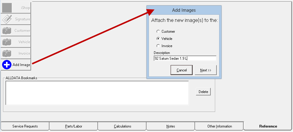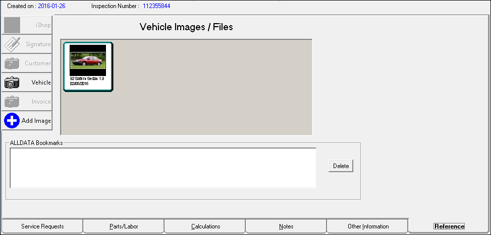 This main purpose of this tab is to store images with the estimate or repair order. In addition, ALLDATA Bookmarks are stored here.
