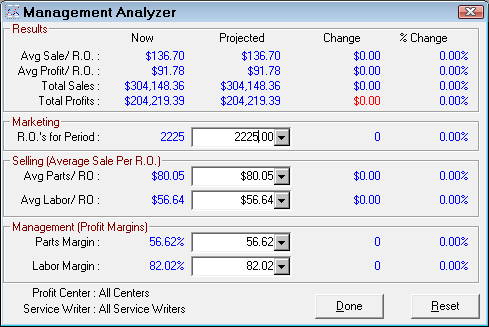 The results of the search criteria are shown in the top box. Criteria for projections include marketing, sales per repair order, and management effectiveness that affect profit margins. Analysis may be done for each section to see the individual effect, or combined, as in the illustration, to see the overall effect of several changes. The results of the changes are shown in the projected column, with the revenue change and percent change also listed.