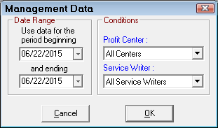 Selection criteria include the beginning and ending date of shop information to include in the analysis, the profit center to include, and which service writer to analyze.