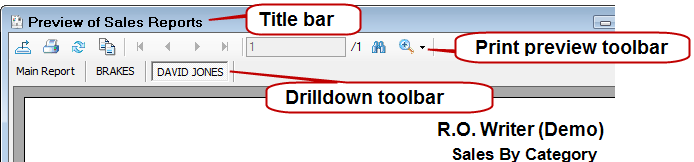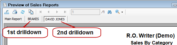 For example, in the Sales by Category report, double-click on a Category to see data for only that category. The drilldown report shows all technicians who performed that job. Then, you can double-click on a technician to see each one of those jobs on another drilldown report.