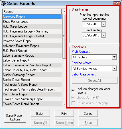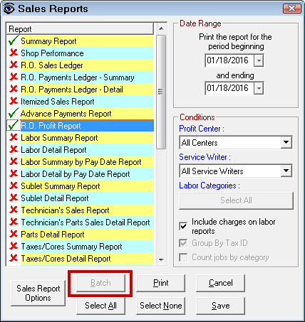 - Click Save to saves the batch report selections. The next time you click the Batch button, the chosen reports are selected automatically.