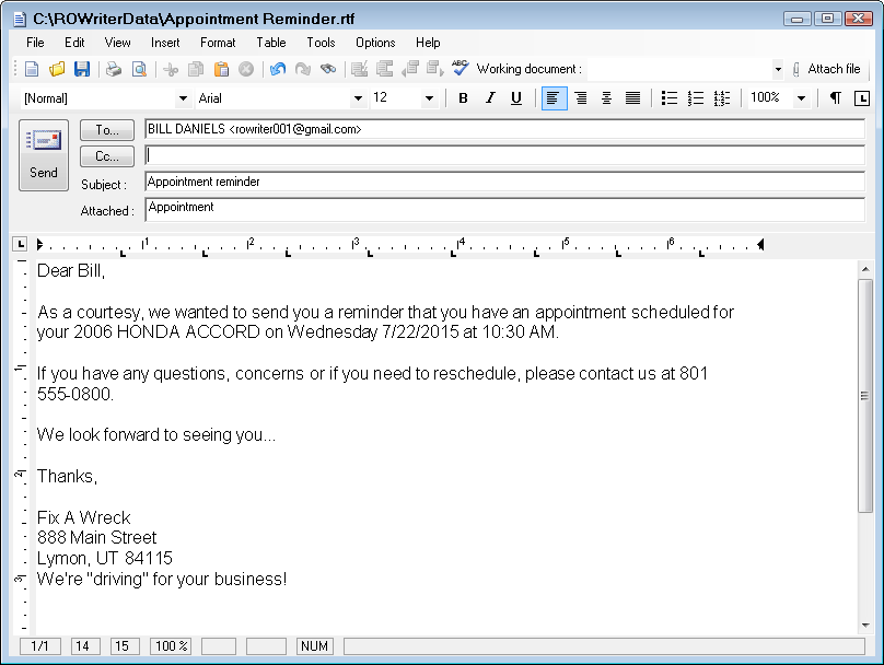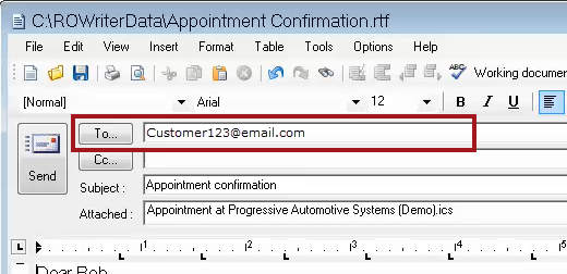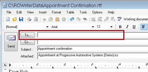 - Click Yes, the appointment reminder email appears with the To line blank.