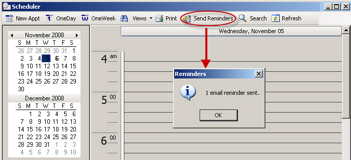 To send reminder emails for all appointments due within the specified number of hours - e.g., a day, a week, a weekend - select the timeframe and click the Send Reminders button from the Scheduler toolbar.