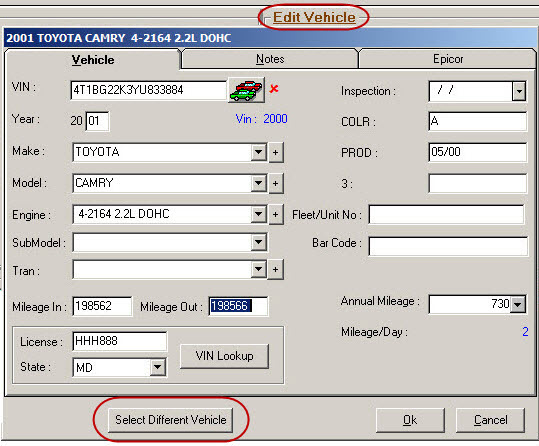 2. Select the vehicle currently being serviced and click OK or press ENTER.
