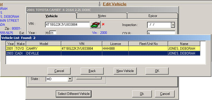 1. Click Select Different Vehicle and list of vehicles associated with this customer appears.