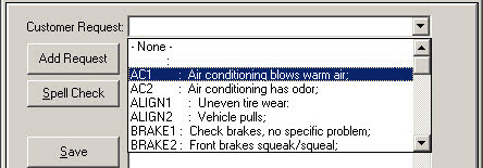 R.O. Writer ships with a set list of service requests in the Customer Request dropdown list.