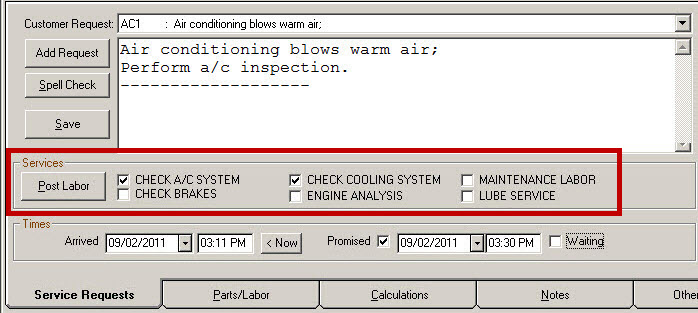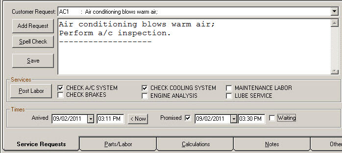 The Service Requests tab provides a method of documenting the customer’s requests. Many repairs begin with a customer’s request for service, describing symptoms of what is wrong. The service request tab allows you to enter some of the more commonly requested inspections and services.