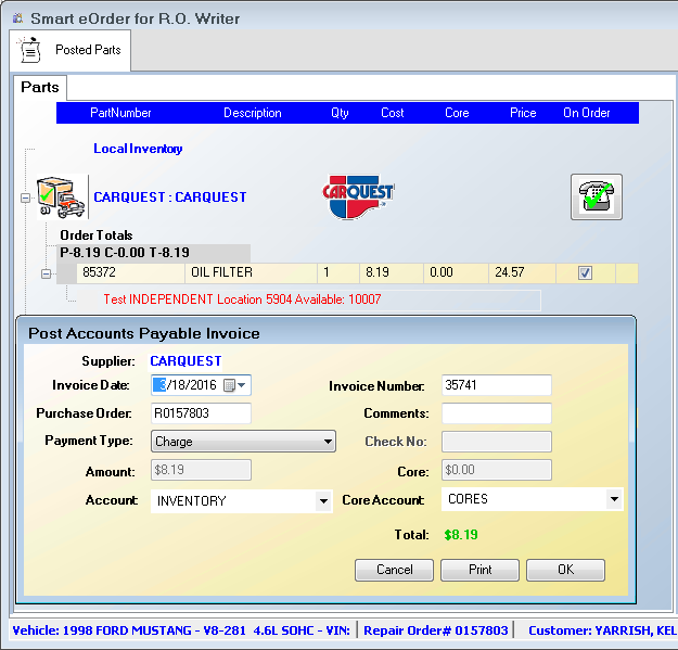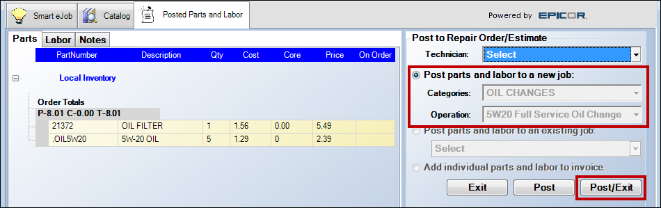 - The Posted Parts and Labor tab appears displaying the selected parts.