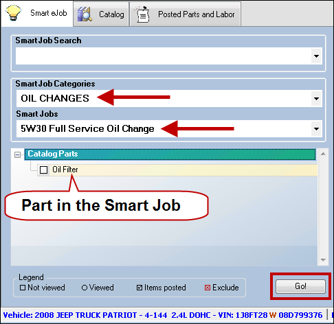 - Click the Go! button to search your local inventory and online catalogs for the parts in the Smart eJob.