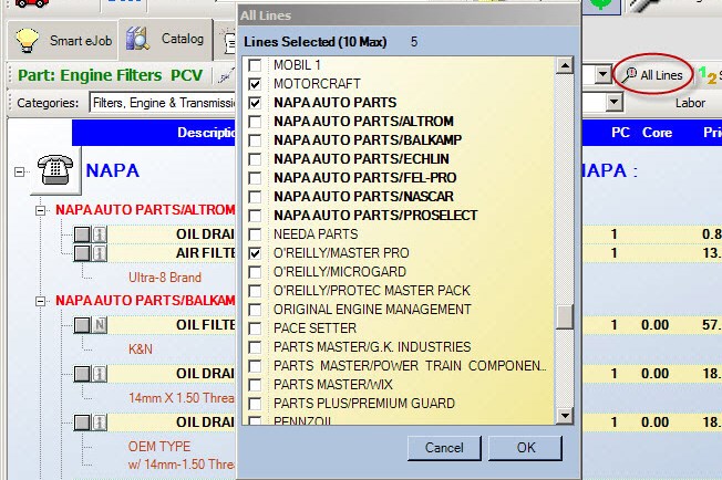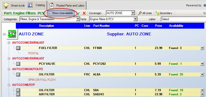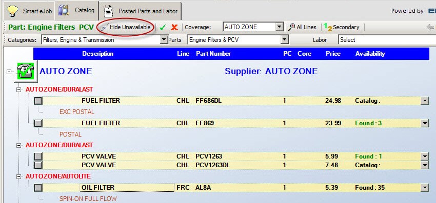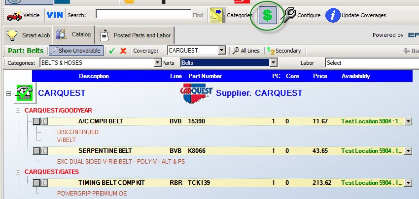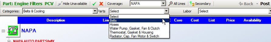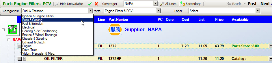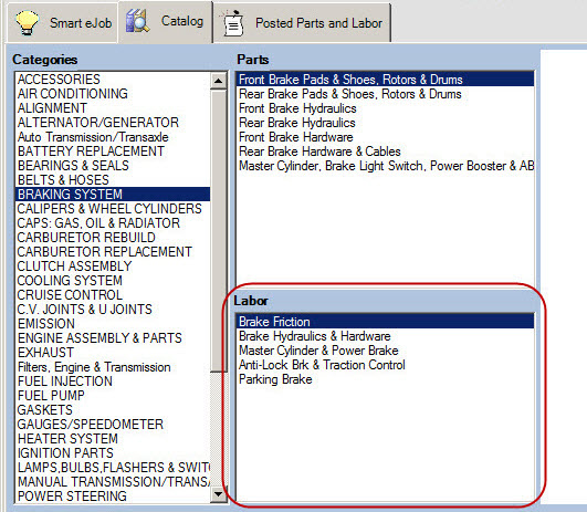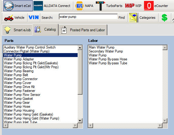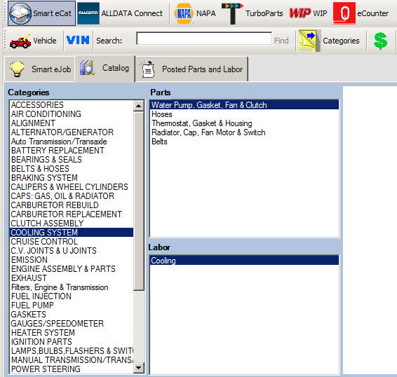 After a search has been completed, you can select different categories, parts, and labor in two ways:
