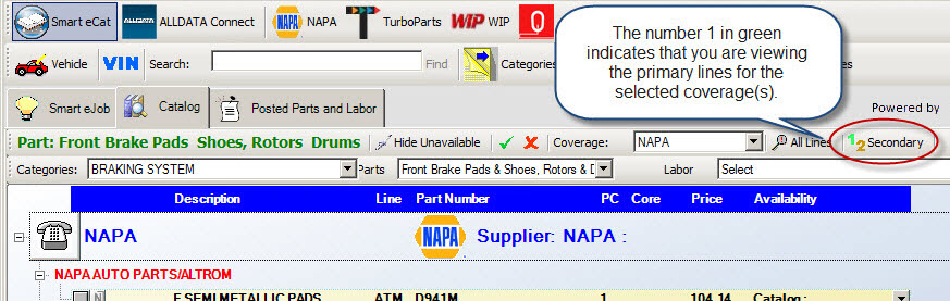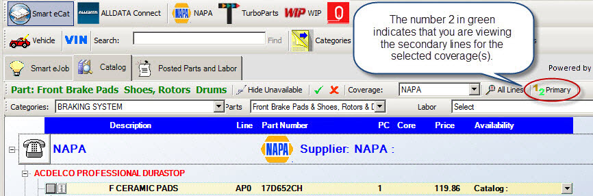 In Smart eCat you can switch between viewing Primary lines and Secondary lines by clicking on the or
