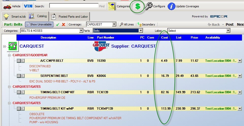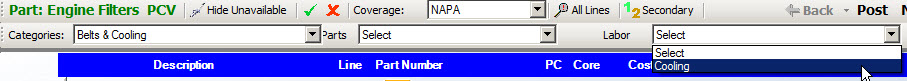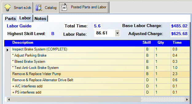 In the above example, the first 4 labor jobs are all shaded the same color and will post as a group to one labor job. The Remove & Replace Water Pump is shaded a different color indicating that this job will post to a second labor job on the ticket. The last 3 jobs are all shaded a different color and they will post as a group to a third labor job on the ticket.