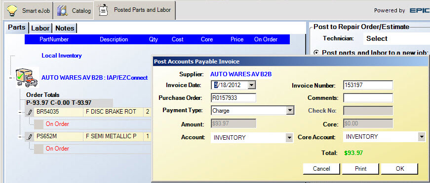 When labor and parts are posted, you can view them by clicking the Posted Parts and Labor tab. You can then order the parts and post the ticket from this tab.