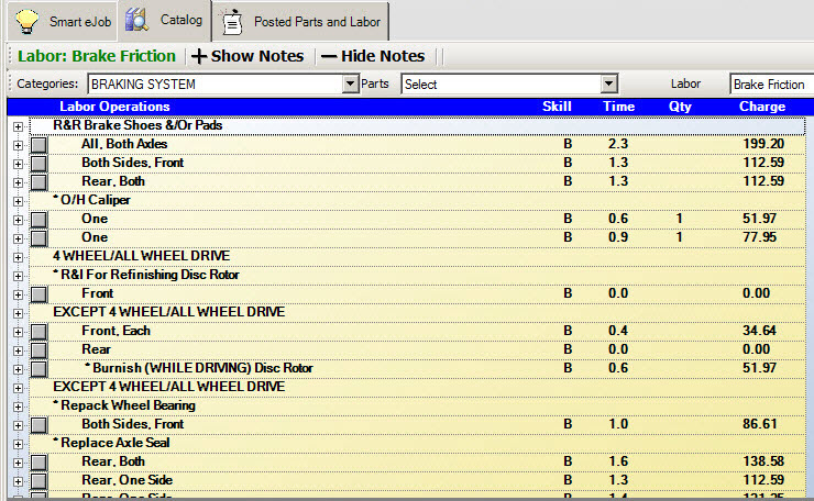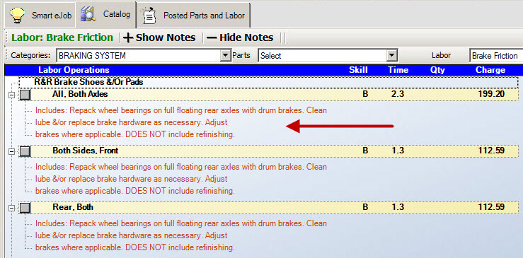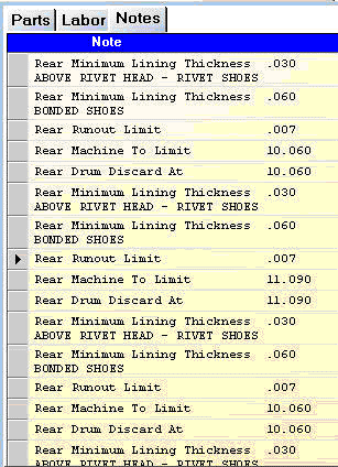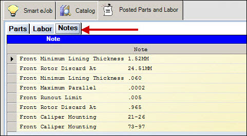 The Notes Tab contains catalog specifications or Epicor part specifications that are posted. These notes transfer to the repair order or estimate in the labor description.