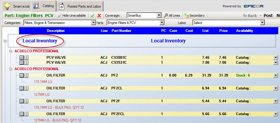 If parts are found and in stock in your local inventory, the Local Inventory section is open at the top of the window.