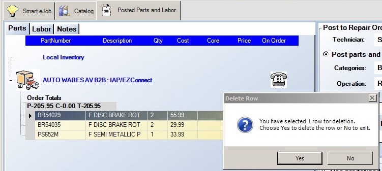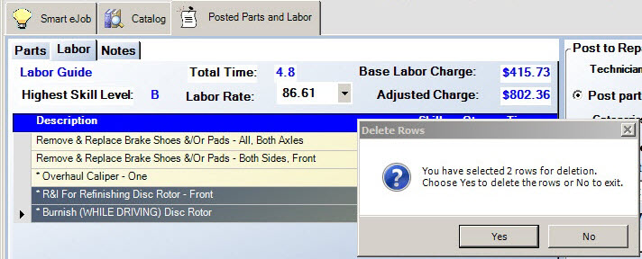 If you wish to delete a part from the posted parts and labor tab, click on the gray area before the part number to highlight the entire line and press the Delete key on the keyboard.