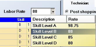 When posting labor, the highest skill level will be used to determine the labor rate; however, the labor rate can be changed using the dropdown list by the labor rate. The Total Time of all labor jobs in the shopping cart is also shown.