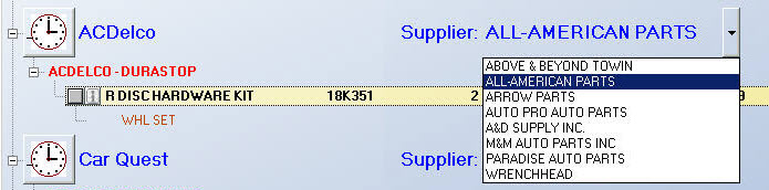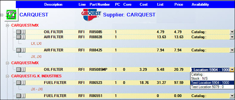 Where the item is available: Stock (your local inventory), Region, or Branch. If you have the part on hand in your R.O. Writer inventory, this column displays "Stock [# on-hand]". The on-hand value is defined as Your on-hand quantity minus the quantity committed on open repair orders, plus the quantity on-order (The quantity of that part on purchase orders not yet received.) Your on-hand quantity minus the quantity committed on open repair orders if the Ignore On Order Parts When Displaying On Hand Inventory Quantities option is selected in Configuration, the on-hand values displayed in Smart eCat is your on-hand minus the number committed. If you do not have the part in your inventory, this column displays "N/S". If the Region or Branch has it available for you to order online, the store will show the quantity available. You can change the where you order the part from by selecting catalog, store, or Stock in the dropdown list. The core, cost, and list price change and the price is recalculated to match the new location. If you click on the core, cost, list, or price, you also get a dropdown list with the options available to select from. |