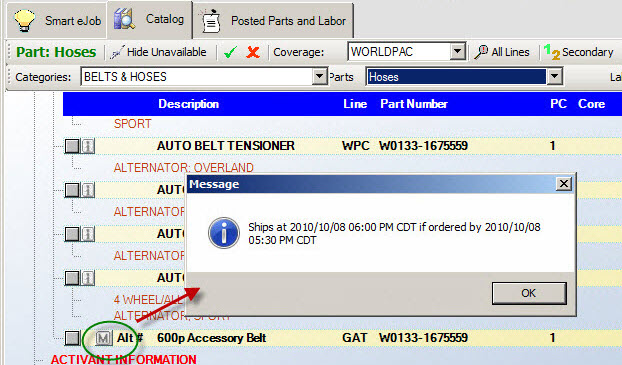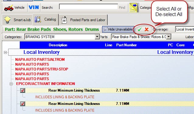 NOTE: If you are viewing Epicor information and it is on the same window as parts, clicking the green check mark button to select all selects all specifications as well as all parts. An alternative option would be to create a separate coverage list just for Epicor Information and remove that coverage from all your other coverages.
