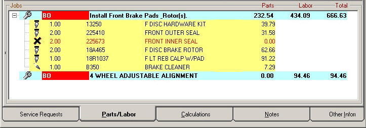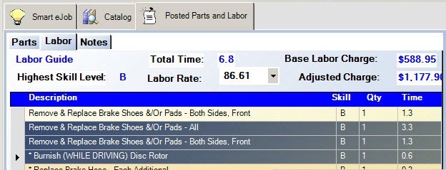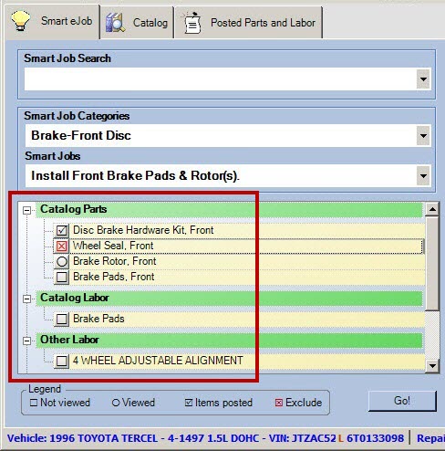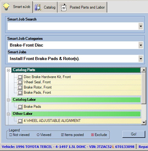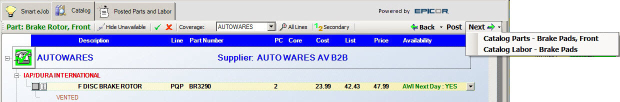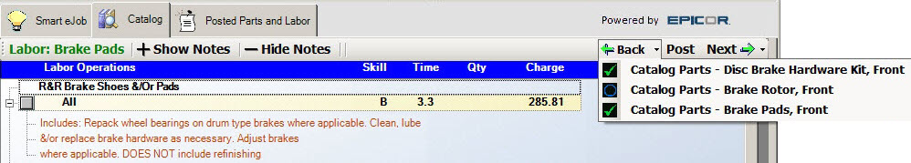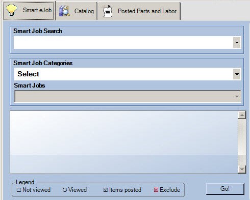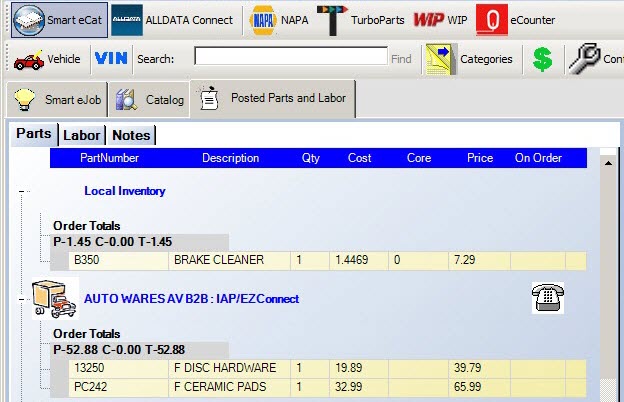 This tab displays the parts and labor that have been posted. After a part has posted, you can order them online. When you exit Smart eCat, the smart job with parts and labor are posted to the repair order.