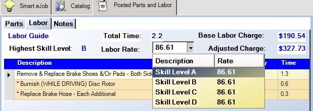 When posting labor, the highest skill level is used to determine the labor rate; however, you can change it by selecting another one in the Labor Rates dropdown list.