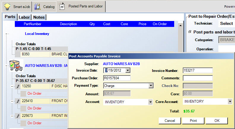 If you are not using the R.O. Writer Accounts Payable module and the supplier you are ordering from has the Post to Accounts Payable Option selected as part of its electronic ordering setup: