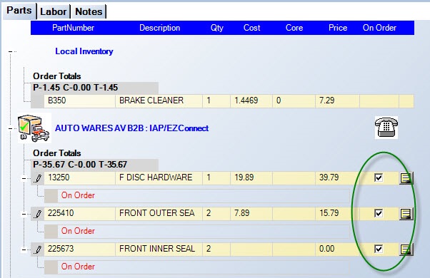Items that are available to order online display a Truck button. Click the Truck button to order parts online. When parts have been ordered the On Order box is checked.