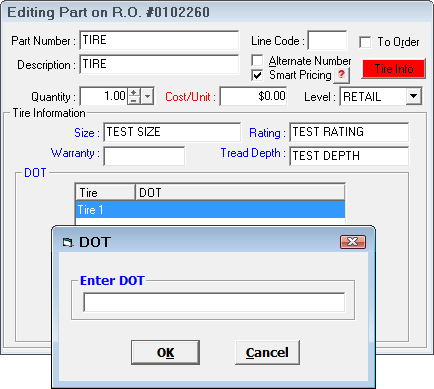 - If no tire information was entered in the part record, you can enter it in the fields. Click OK and the tire information is added and saved to the part on the ticket only.